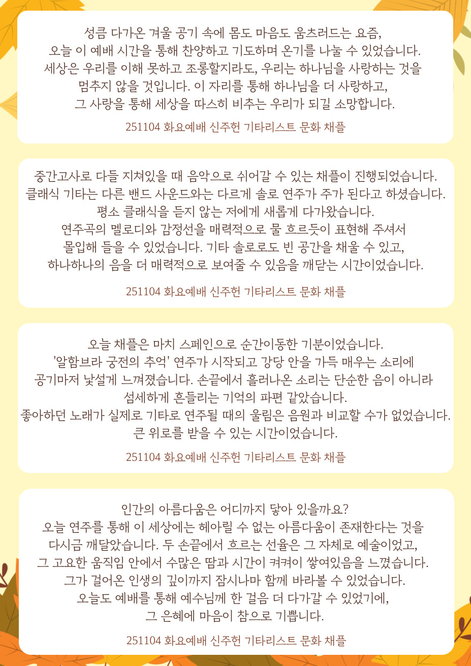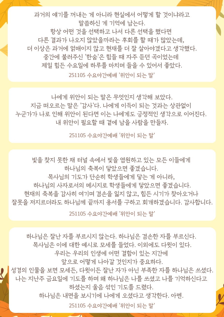 | 2025학년도 2학기 10월 4주차 채플 말씀카드 우수 소감문 선정자를 아래와 같이 안내드립니다. - 11월 1주차 8명 하단에 자신의 학번을 확인 후 교목실에 방문해주시면 리워드 지급합니다. 앞으로도 많은 학생들이 소감문을 통해 생각과 마음을 나눌 수 있기를 기대합니다.