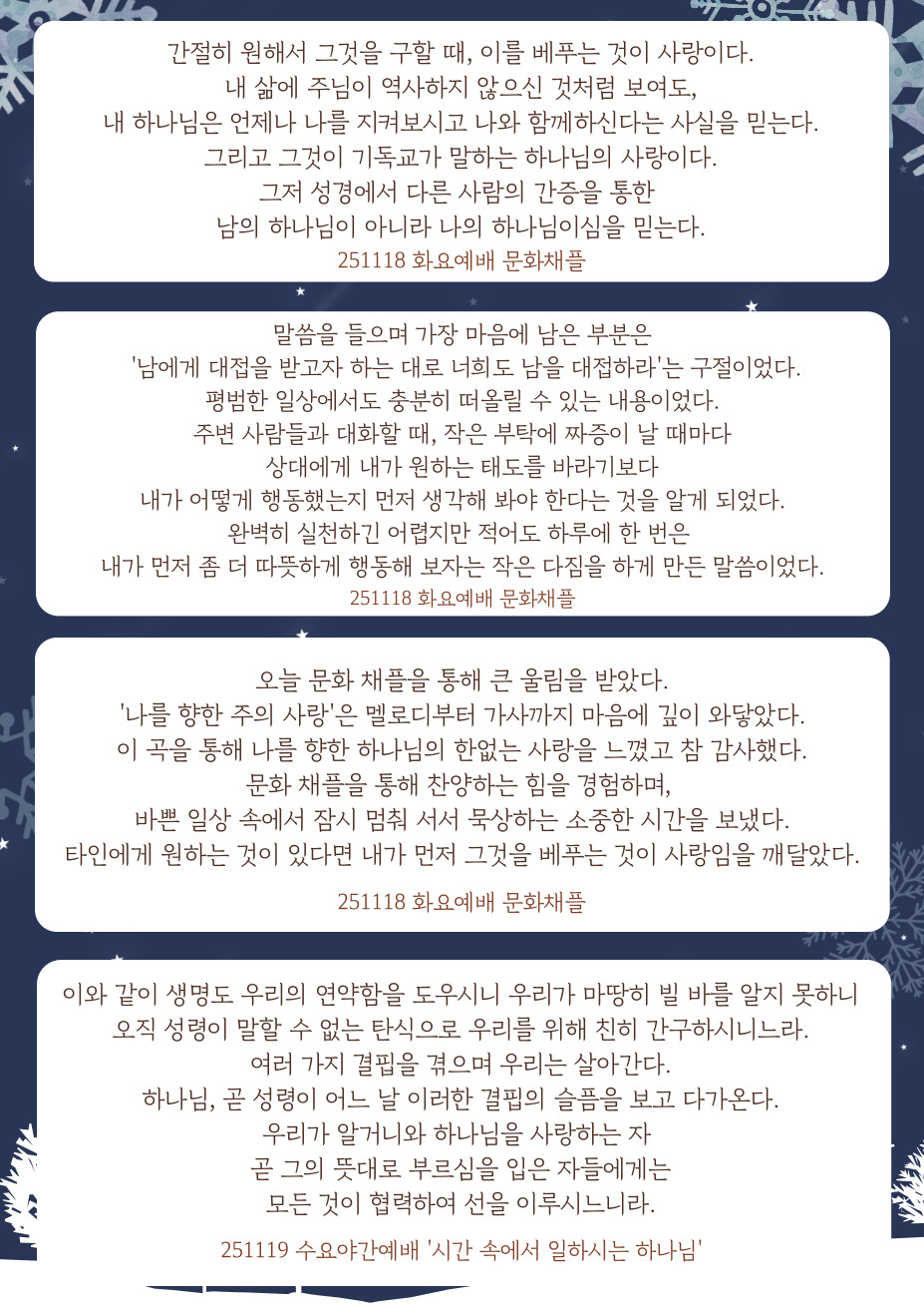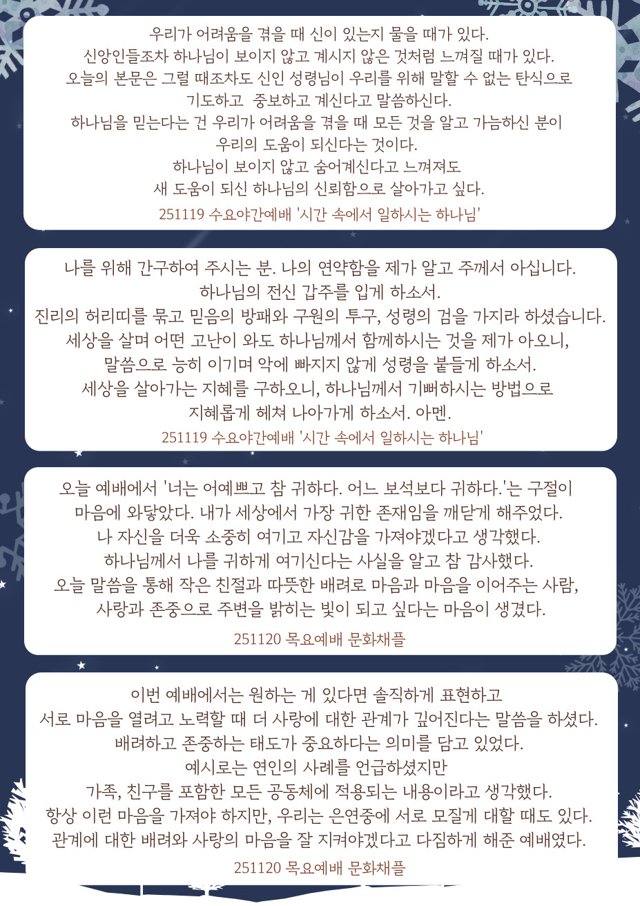 | 제목 | 11월 3주차 채플 소감문 우수자 선정 공지 | ||