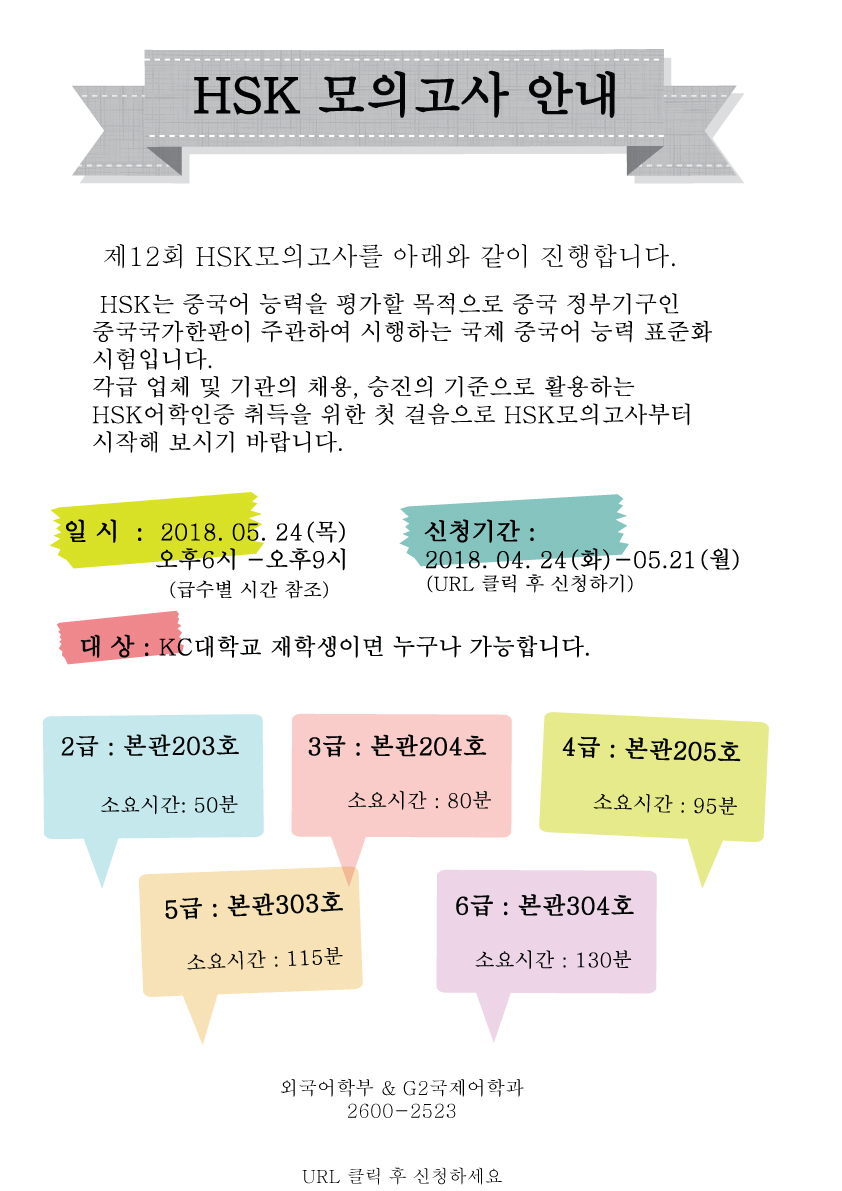 ○ 대 상 : KC대학교 재학생 2급(본관203호) 듣기 : 35문제. 독해:25문제. 응시시간 : 50분. 3급(본관204호) 듣기 : 40문제. 독해:30분제. 응시시간 : 80분. 4급(본관205호) 듣기 : 45문제. 독해:40문제. 쓰기:15문제. 응시시간 : 95분. 5급(본관303호) 듣기 : 45문제. 독해:45문제. 쓰기:10문제. 응시시간 : 115분. 6급(본관304호) 듣기 : 50문제. 독해:50문제. 쓰기:1문제 . 응시시간 : 130분 ○ 문의 : 외국어&G2국제어학과 02-2600-2523