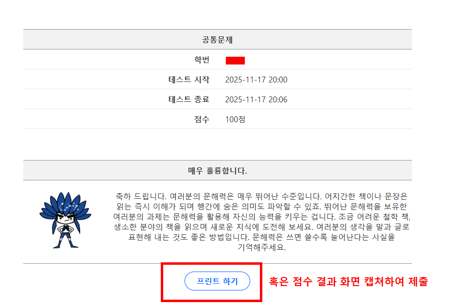 6. 프린트 하기 클릭하여 PDF로 저장하여 제출 혹은 결과 화면이 잘 나오도록 이미지 캡쳐하여 제출