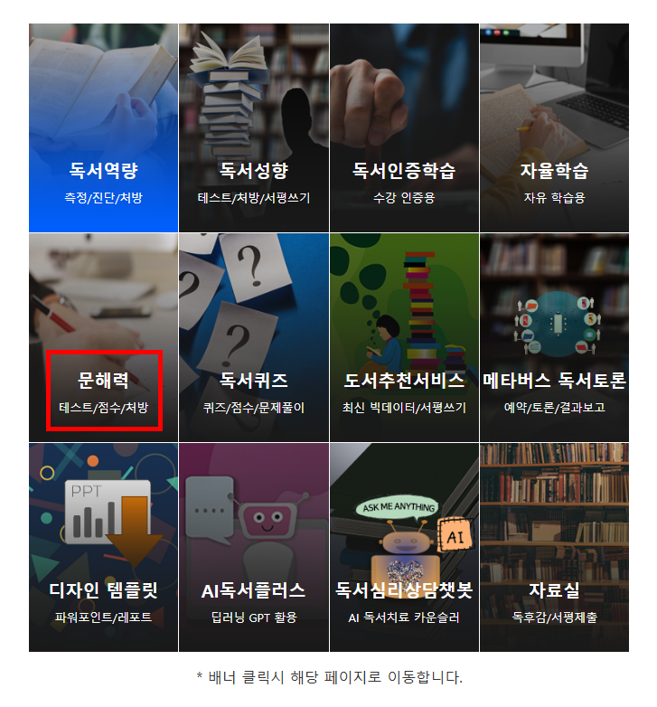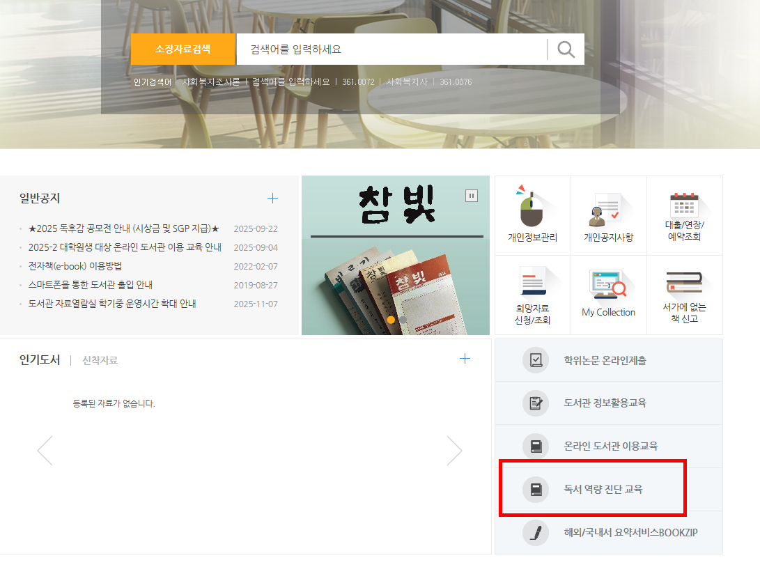 1. 도서관 홈페이지 - 독서 역량 진단 교육 클릭
