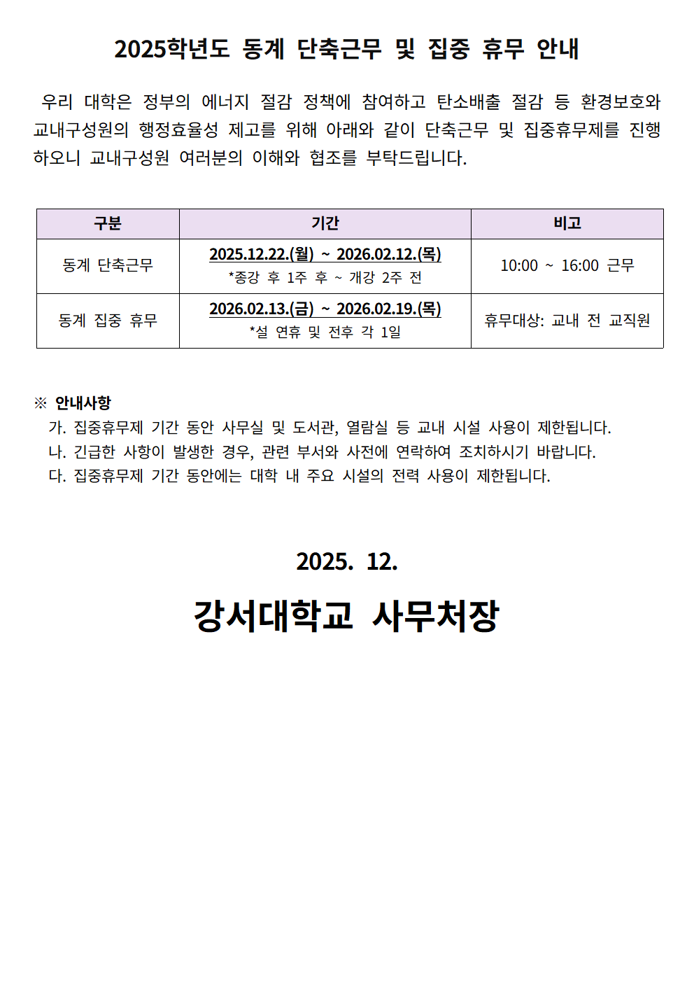 2025학년도 동계방학 단축근무 및 집중휴무 안내