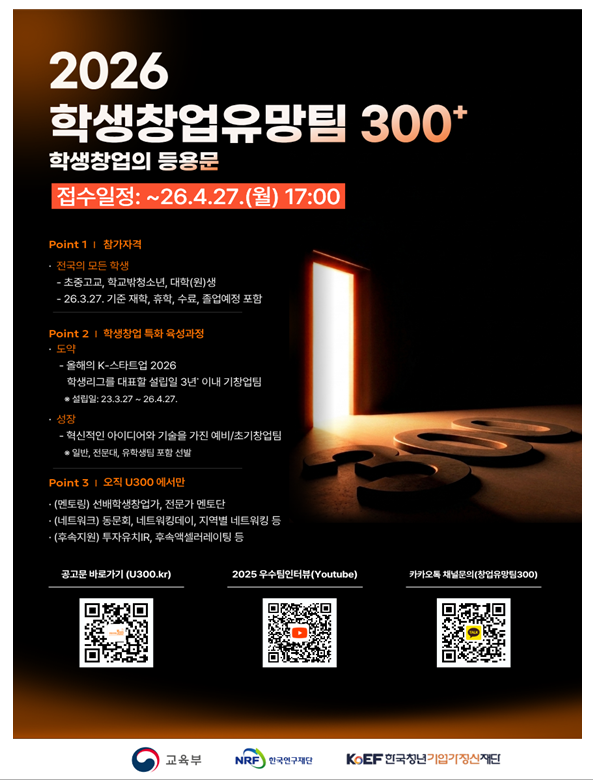 게시판 상세(일반) 게시물 상세보기 - 제목, 등록일, 조회, 작성자, 내용으로 구성 제목2026 학생창업 유망팀 300+ 등록일2026-04-03조회38 작성자취창업지원센터 참여링크및 양식: https://u300.kr/board/notice/detail/497 목록
