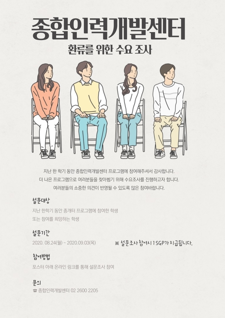 지난 한 학기 동안 종합인력개발센터 프로그램에 참여해주셔서 감사합니다. 더 나은 프로그램으로 여러분들을 찾아뵙기 위해 수요조사를 진행하고자 합니다. 여러분들의 소중한 의견이 반영될 수 있도록 많은 참여바랍니다.