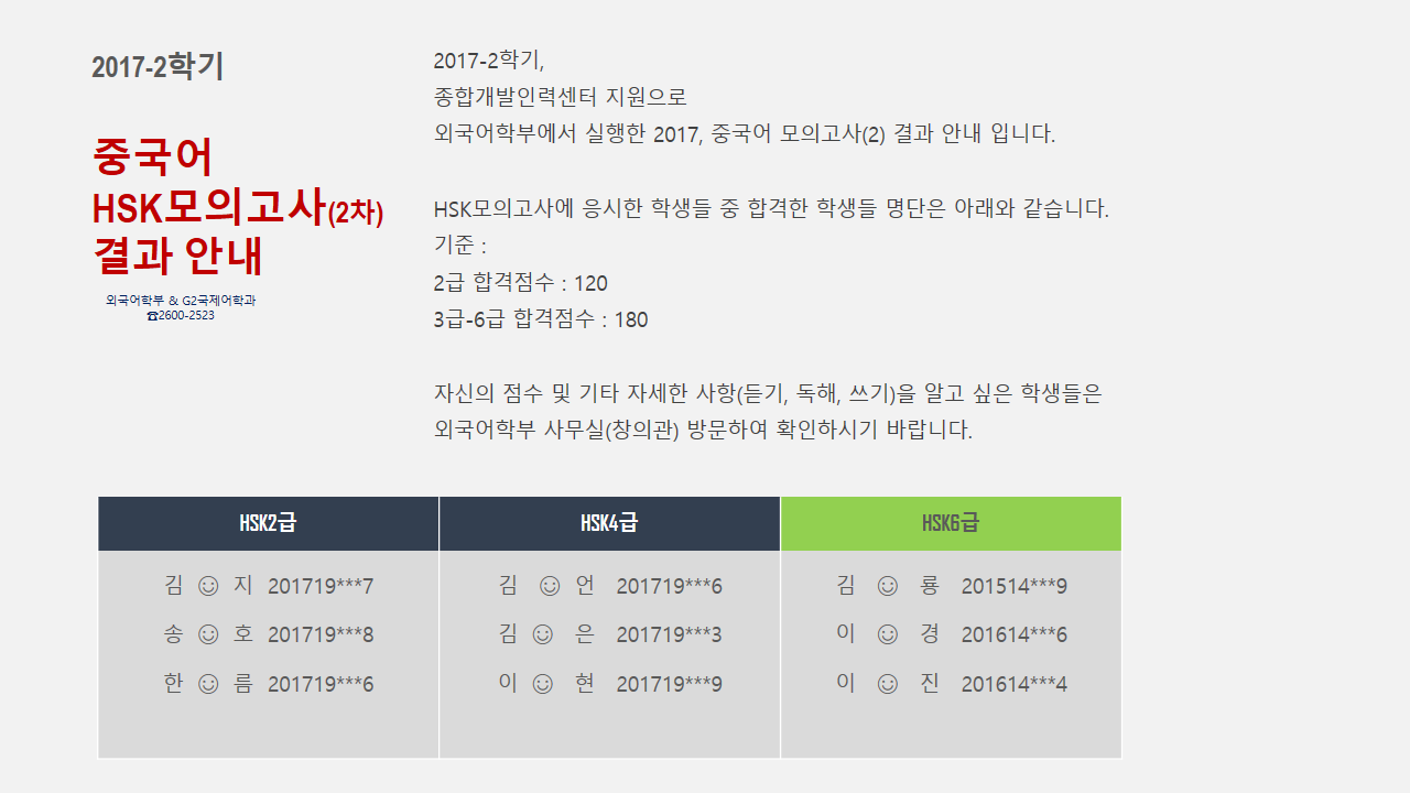 2017-2학기 종합개발인력센터 지원으로 외국어학부에서 실행한 2017, 중국어모의고사(2) 결과 안내입니다. HSK모의고사에 응시한 학생들 중 합격한 학생들 명단을 아래와 같습니다. 기준 2급 합격점수 : 120. 3급~6급 합격점수 : 180. 자신의 점수 및 기타 자세한 사항(듣기, 독해, 쓰기)을 알고 싶은 학생들은 외국어학부 사무실(창의관)방문하여 확인하시기 바랍니다. ■ 2급 김 ○ 지 201719***7 송 ○ 호 201719***8 한 ○ 름 201719***6 ■4급 김 ○ 언 201719***6 김 ○ 은 201719***3 이 ○ 현 201719***9 ■6급 김 ○ 룡 201514***9 이 ○ 경 201614***6 이 ○ 진 201614***4