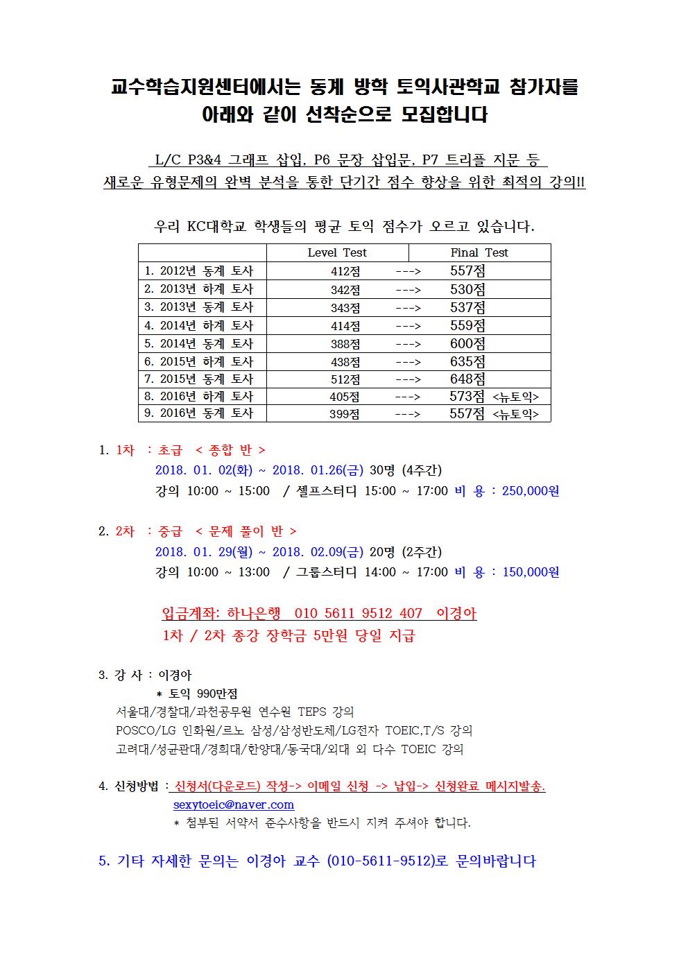 | 제목 | ♣교수학습지원센터♣ 2017학년도 동계 토익사관학교 재안내 | ||