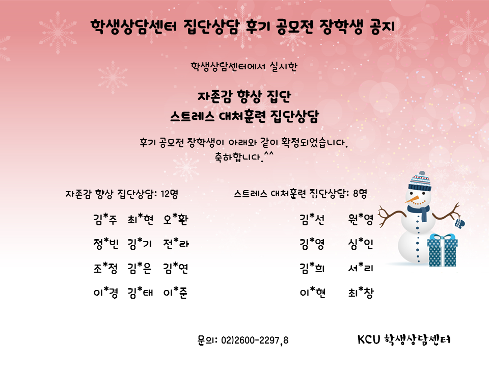 | 제목 | [학생상담센터] 집단상담(자존감, 스트레스) 후기 공모전 장학생 공지 | ||