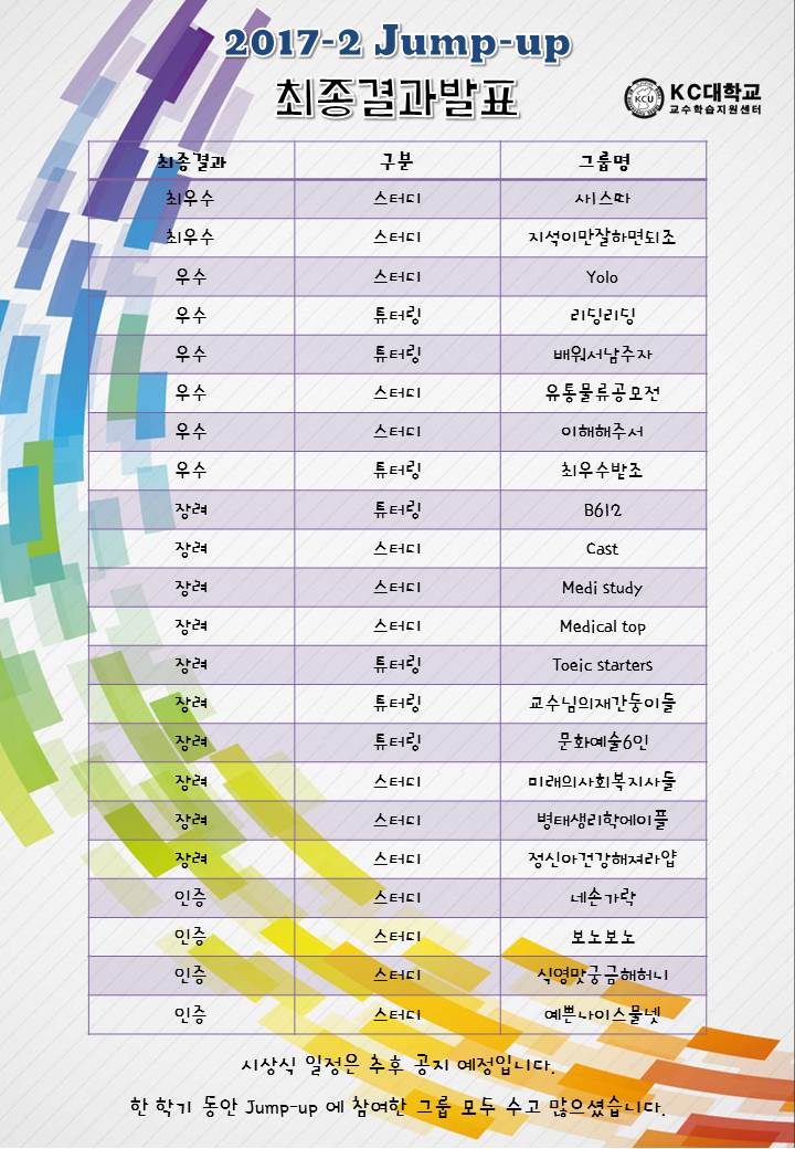 | 제목 | ♣교수학습지원센터♣ 2017-2 Jump-up 최종 결과 발표 | ||