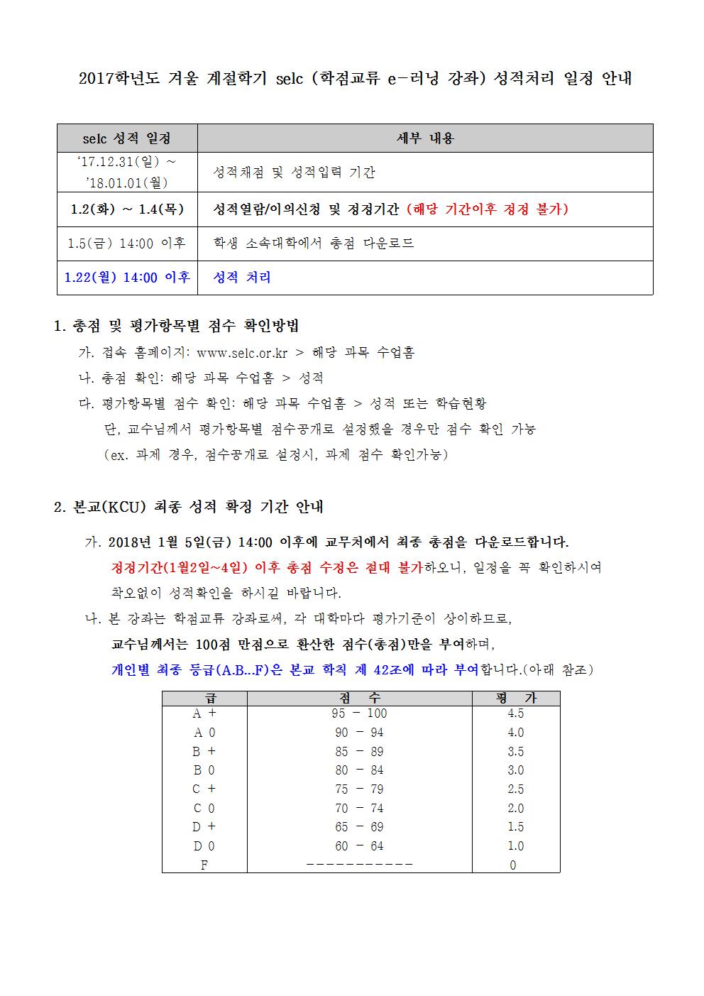 [교무처] 2017학년도 겨울 계절학기 온라인강좌 성적처리 일정 안내