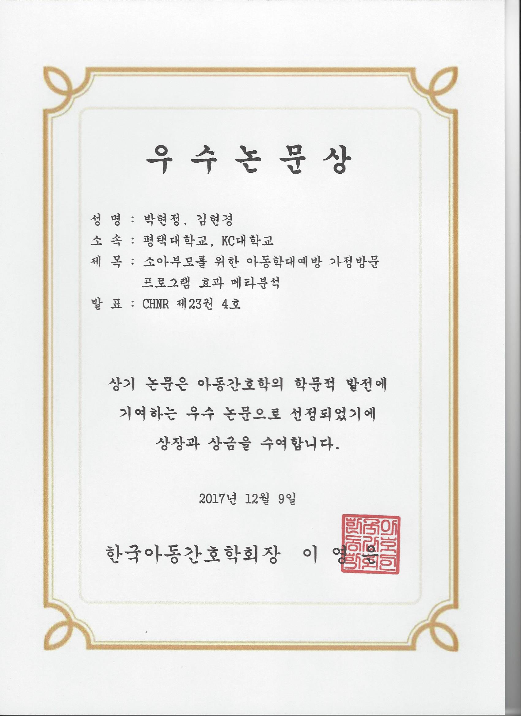 수상 일시 및 장소 : 2017년 12월 9일 고려대학교 한국아동간호학회 동계학술대회