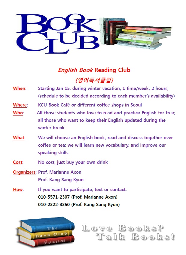 알찬 겨울 보내고 계십니까? 더욱 알찬 겨울을 위해 아래와 같이 영어 북리딩/토론 클럽을 운영하고자 합니다. 영어학습을 지속하고, 영어읽기향상에 관심있는 학생들은 주저말고 연락 바랍니다. 전공분야와 무관하게 참여가 가능합니다. 언어는 쓸수록 늘고 쓰지 않으면 잃게됩니다. 참여를 희망하시면 1월 15일까지 아래에 있는 강상균 또는 마리아나 액슨 교수에게 연락 바랍니다. 궁금한 사항에 대해서도 연락주세요. 모임시간은 추후논의하고 결정할 예정입니다.