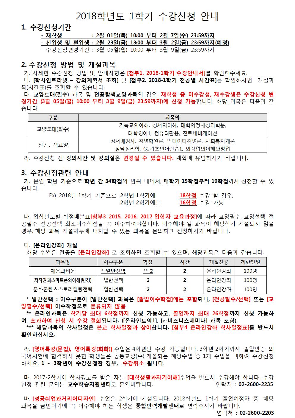 | 첨부파일 | [첨부1]2018학년도 1학기 수강안내서.hwp | ||