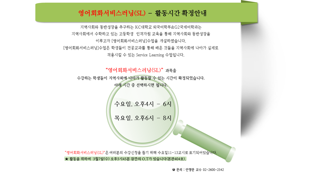 [외국어학부&G2국제어학과] 영어회화서비스러닝(SL) 활동시간 확정안내