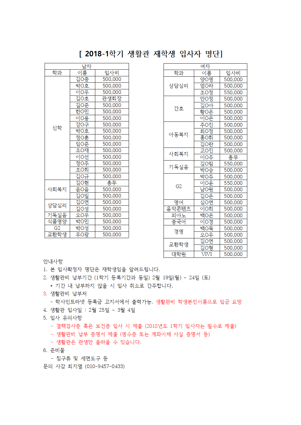 [생활관] 2018년도 1학기 재학생 입사자 명단
