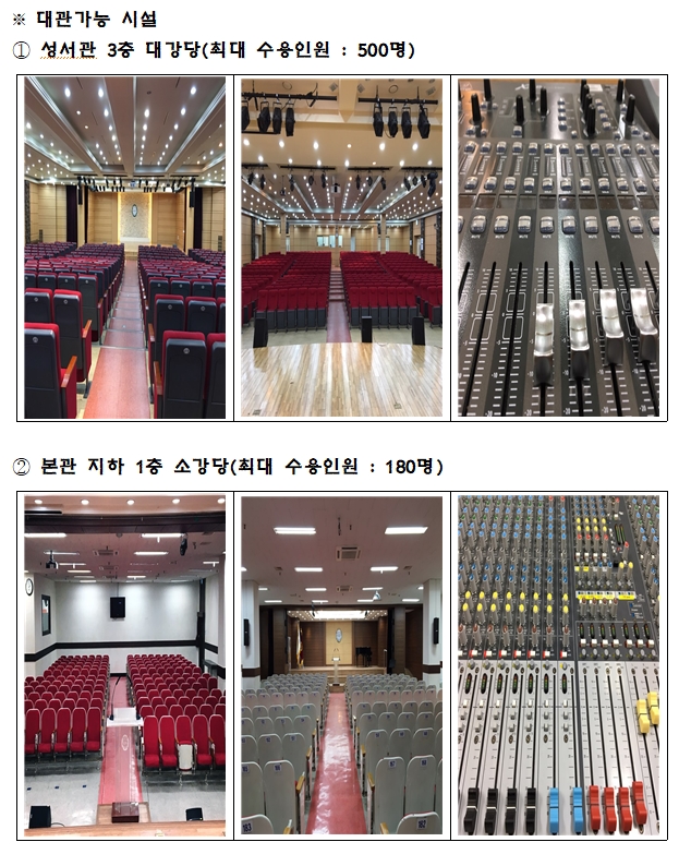 ※ 대관 절차 ① 대관신청 : 사무처 총무과 ☎ 02-2600-2474, e-mail :kc1@kcu.ac.kr, Fax : 02-2698-8876 ② 사용가능 여부 통보(24시간 이내) ③ 시설 대여료 입금(시설 사용 7일 전까지) ④ 시설 사용 첨부파일 : 신청서 양식 다운로드