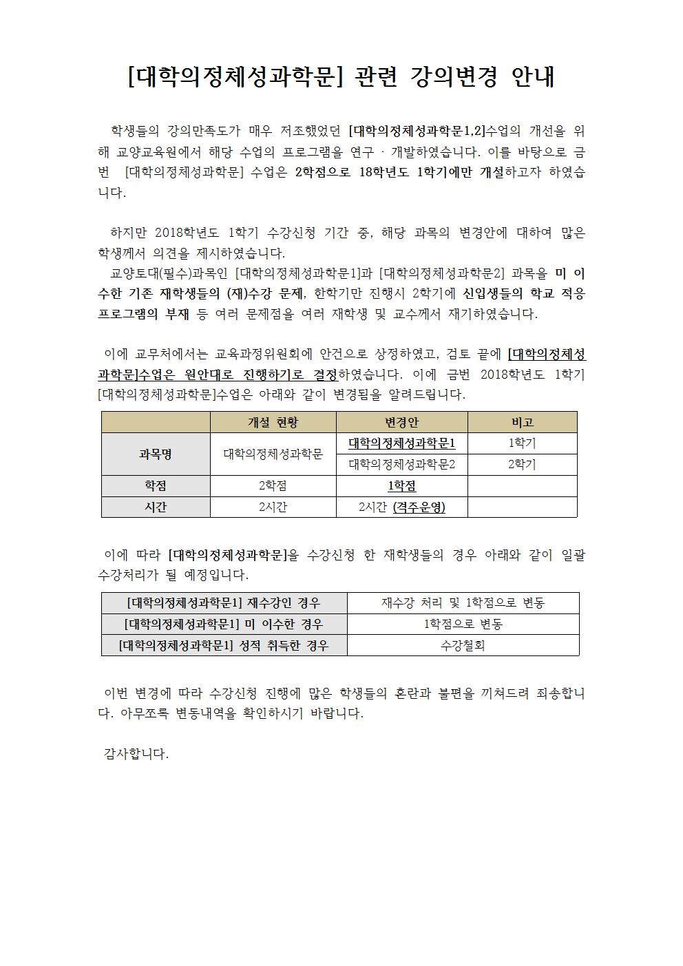 [교무처] [대학의정체성과학문] 관련 강의변경 안내