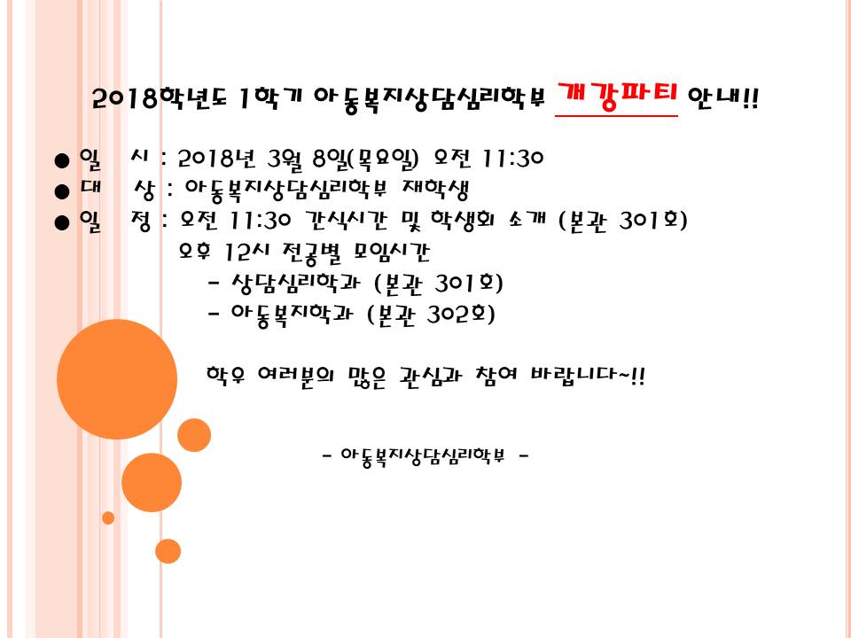 | 제목 | [아동복지상담심리학부] 2018학년 1학기 개강모임 및 교과과정 설명회 안내 | ||