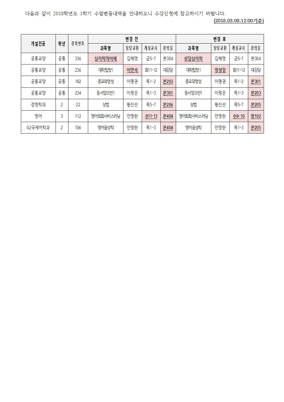 [교무처] 2018학년도 1학기 수업 변동 안내