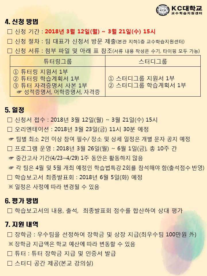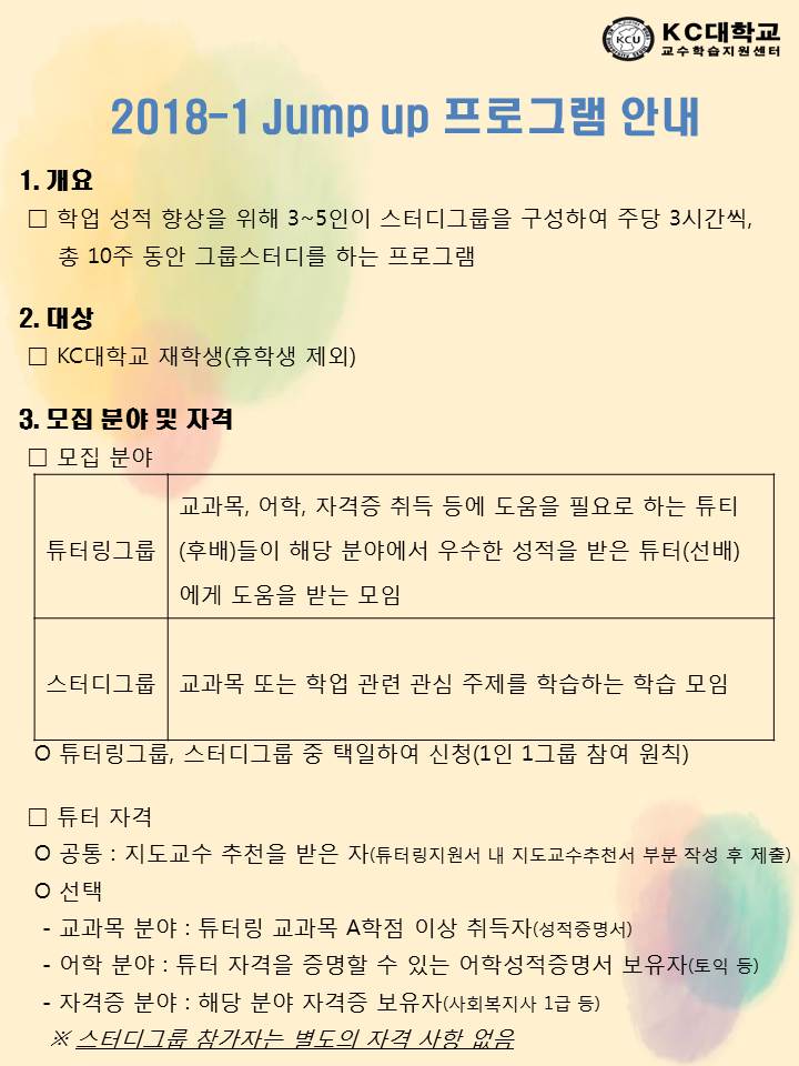 안녕하세요 교수학습지원센터입니다. 2018-1 Jump up 프로그램을 아래와 같이 공지합니다. 열심히 공부하고 싶은 KC대학교 재학생 누구나 Jump up 프로그램에 참가해주세요. 교수학습지원센터가 여러분을 지원하겠습니다. 문의 : 02-2600-2236