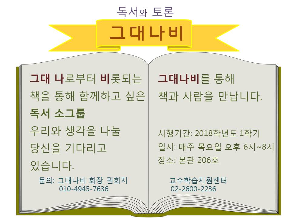 | 안녕하세요 교수학습지원센터입니다. 독서토론동아리 그대나비에서 회원을 모집합니다. 관심 있는 학생은 아래 회장의 연락처로 문의하여 주세요. 감사합니다.