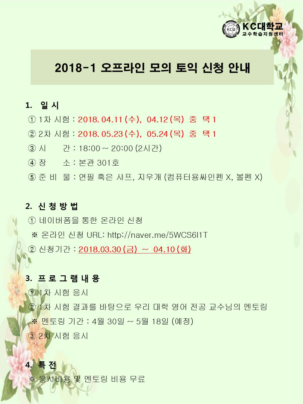 | 제목 | [교수학습지원센터] 2018-1 오프라인 모의토익 신청 재안내 | ||