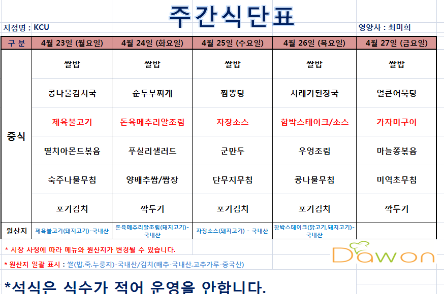 | 제목 | 4월 4주(23일~27일)식단표 | ||