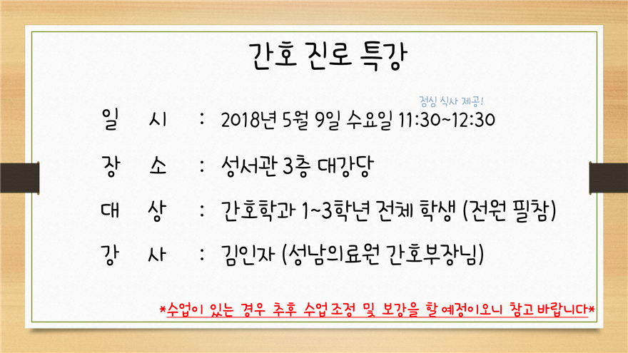 게시물 상세보기 - 제목, 등록일, 조회, 작성자, 내용으로 구성 제목 [간호학과] 간호학과 진로특강공지 등록일 2018-04-23 조회 2430 작성자 김한나