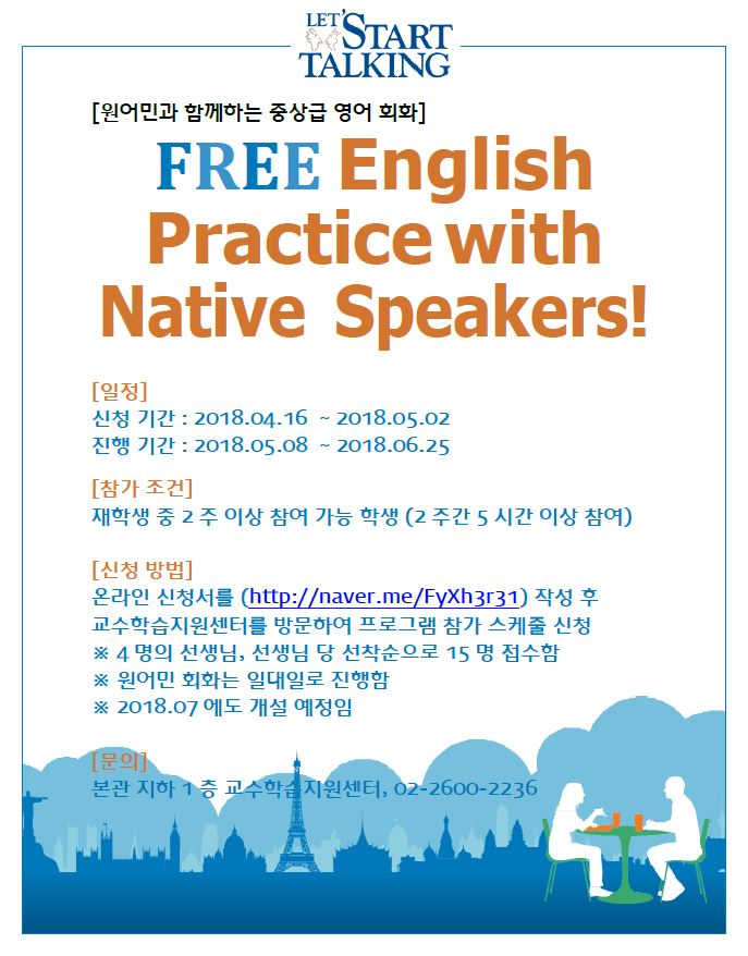 | 제목 | [교수학습지원센터] 2018-1 LST 중상급 영어회화 프로그램 재안내 | ||