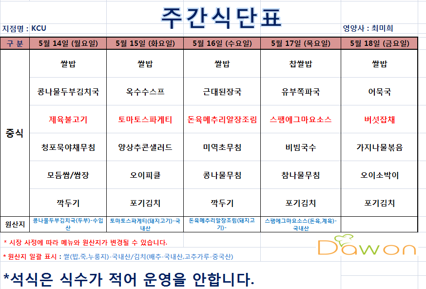 | 제목 | 5월 3주(14일~18일)식단표 | ||