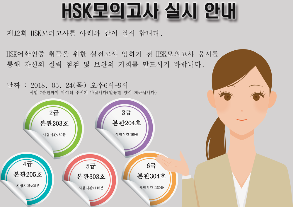 제12회 HSK모의고사를 아래와 같이 실시 합니다. HSK어학인증 취득을 위한 실전고사 입하기 전 HSK모의고사 응시를 통해 자신의 실력 점검 및 보완의 기회를 만드시기 바랍니다.