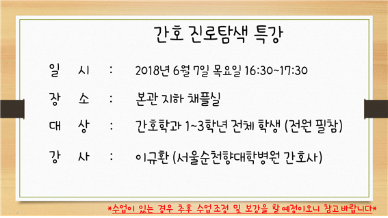 게시물 상세보기 - 제목, 등록일, 조회, 작성자, 내용으로 구성 제목 [간호학과] 간호학과 진로탐색 특강공지 등록일 2018-05-24 조회 3014 작성자 김한나