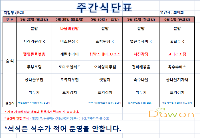 | 제목 | 5월5주(28일~6/1일)주간식단표 | ||||