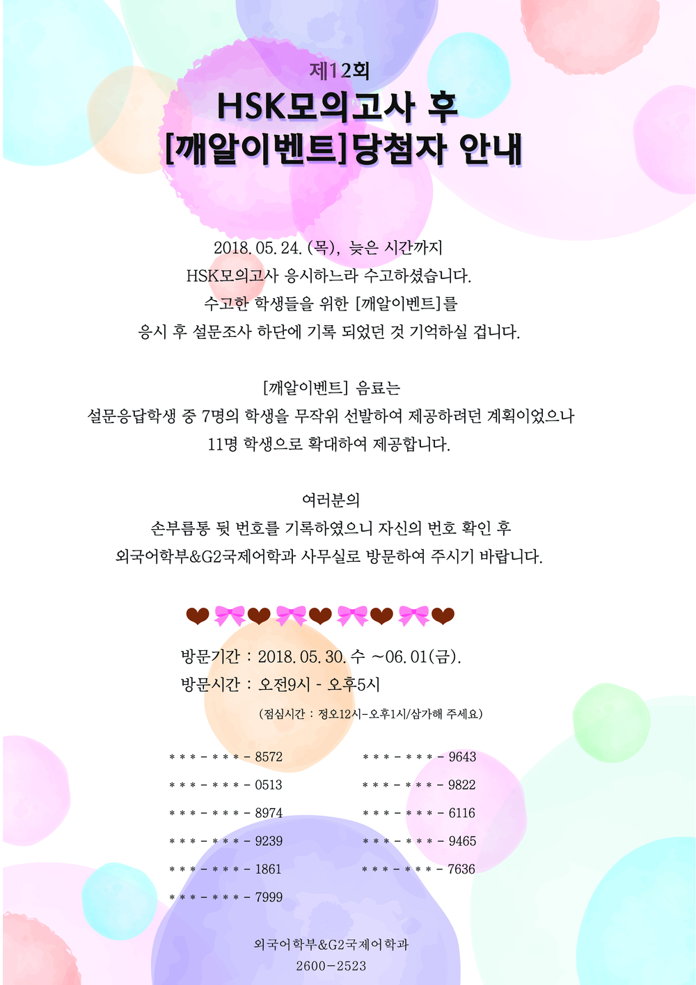 * 교수학습지원센터와 연계| 제목 | [G2국제어학과] HSK모의고사 후[깨알이벤트]당첨자 안내 | ||