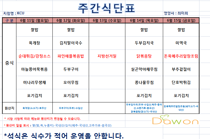 | 제목 | 6월2주(11일~15일)주간식단표 | ||