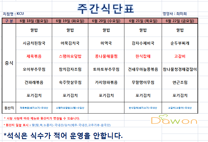| 제목 | 6월3주(18일~22일)주간식단표 | ||