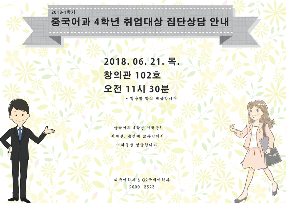 2018-1학기 [중국어과 4학년 취업대상 집단상담 안내] 2018.06.21.목. 창의관102호 오전11시30분 중국어과 4학년 여러분! 서재선, 송경애 교수님께서 여러분을 상담합니다. 외국어/G2국제어학과 02-2600-2523
