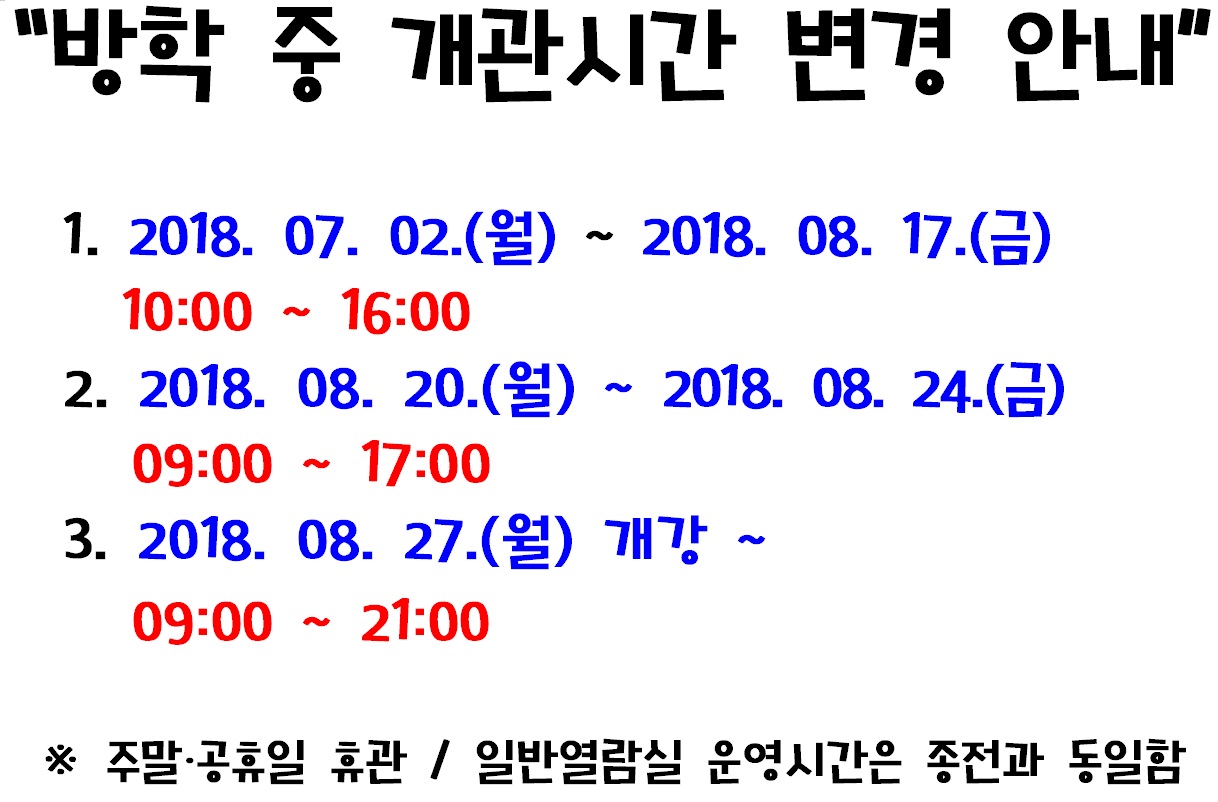 | 제목 | [도서관] 하계방학중 도서관 개관시간 변경 안내 | ||