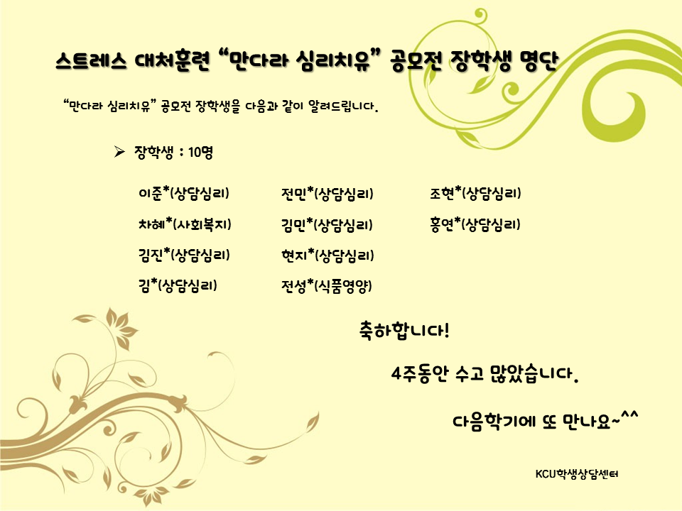 | 제목 | [학생상담센터] 스트레스 대처훈련 “마그마 심리치유” 공모전 장학생 안내 | ||