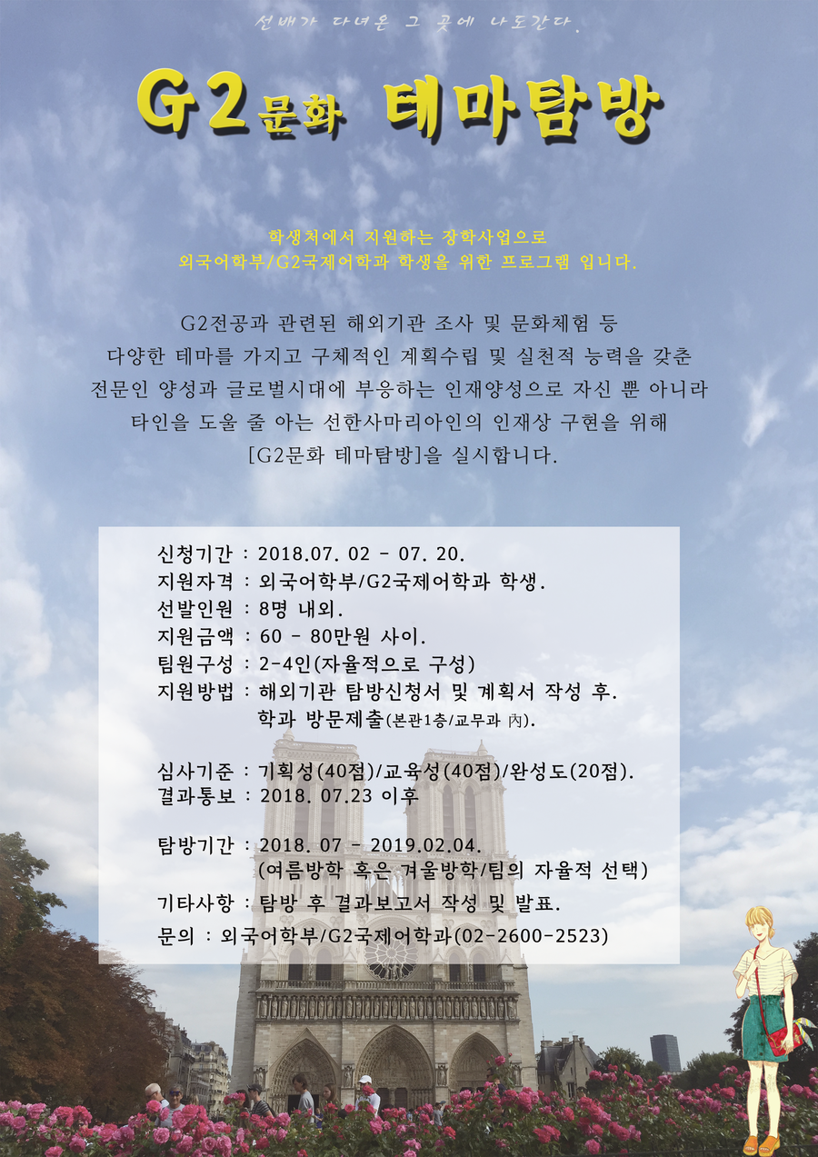 [G2문화 테마탐방]신청 안내 학생처에서 지원하는 장학 사업으로 외국어/G2국제어학과 학생을 위한 프로그램입니다. G2전공과 관련된 해외기관 조사 및 문화체험 등 다양한 테마를 가지고 구체적인 게획 수립 및 실천적 능력을 갖춘 전문인 양성과 글로벌 시대에 부응하는 인재양성으로 자신 뿐 아니라 타인을 도울 줄 아는 선한 사마리아인의 인재상 구현을 위해 [G2문화 테마탐방]을 실시 합니다. ■ 신청기간 ; 2018.07.02.~07.20. ■ 지원자격 : 외국어학부/G2국제어학과 학생 ■ 선발인원 : 8명 내외 ■ 지원금액 : 60~80만원 사이. ■ 팀원구성 : 2~4인(자율적으로 구성) ■ 지원방법 : 해외기관 탐방신청서 및 계획서 작성 후. 학과 방문제출(본관1층/교무과 內) ■ 심사기준 : 기획성(40점)/교육성(40점)/완성도(20점) ■ 결과통보 : 2018.07.23. 이후 ■ 탐방기간 : 2018.07~2019.02.04. (여름방학 혹은 겨울방학/팀의 자율적 선택) ■ 기타사항 : 탐방 후 결과보고서 작성 및 발표 ■ 문 의 : 외국어/G2국제어학과 02-2600-2523