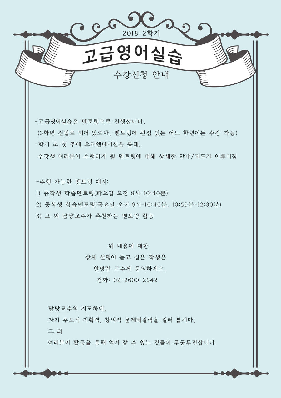 2018-2 [고급영어실습] 수강신청 안내 -고급영어실습은 멘토링으로 진행합니다. (3학년 전필로 되어 있으나, 멘토링에 관심있는 어느 학년이든 수강가능) 학기 초 첫 주에 오리엔테이션을 통해, 수강생 여러분이 수항해게 될 멘토링에 대해 상세한 안내/지도가 이루어집니다. 수행 가능한 멘토링 예시 : 1) 중학생 학습멘토링(화요일 오전9시~오전10시40분) 2) 중학생 학습멘토링(목요일 오전9시~오전10시40분, 오전10시50분~오후12시30분) 3) 그 외 담당교수가 추천하는 멘토링 활동 위 내용에 대한 상세 설명이 듣고 싶은 학생은 안영란 교수께 문의해 주세요. 02-2600-2542 담당교수의 지도하에, 자기 주도적 기획력, 창의적 문제해결력을 길러봅시다. 그 외 여러분이 활동을 통해 얻어 갈 수 있는 것들이 무궁무진 합니다.