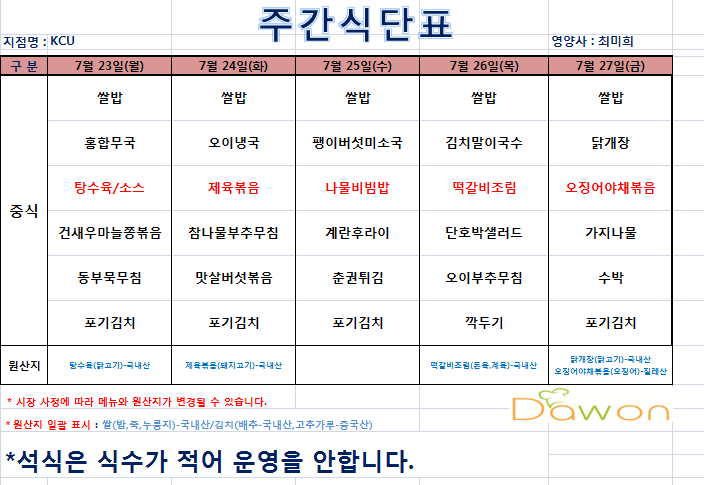 | 제목 | 7월4주(23일~27일)주간식단표 | ||