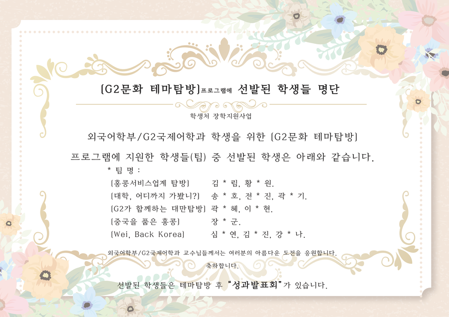 외국어학부/G2국제어학과 학생을 위한 [G2문화 테마탐방] 프로그램에 지원한 학생들(팀)중 선발된 학생은 아래와 같습니다. -팀명- [홍콩서비스업계 탐방] 김✶림, 황✶원. [대학, 어디까지 가봤니?] .송✶호, 전✶진, 곽✶기. [G2가 함께 가는 대만탐방] .곽✶혜, 이✶련. [중국을 품은 홍콩] 장✶군. [Wei, Back Korea] 심✶연, 김✶진, 강✶나. 외국어/G2국제어학과 교수님들께서는 여러분의 아름다운 도전을 응원합니다. 축하합니다. 선발된 학생들은 테마탐방 후“성과발표회”가 있습니다. - G2국제어학과 - 02-2600-2523