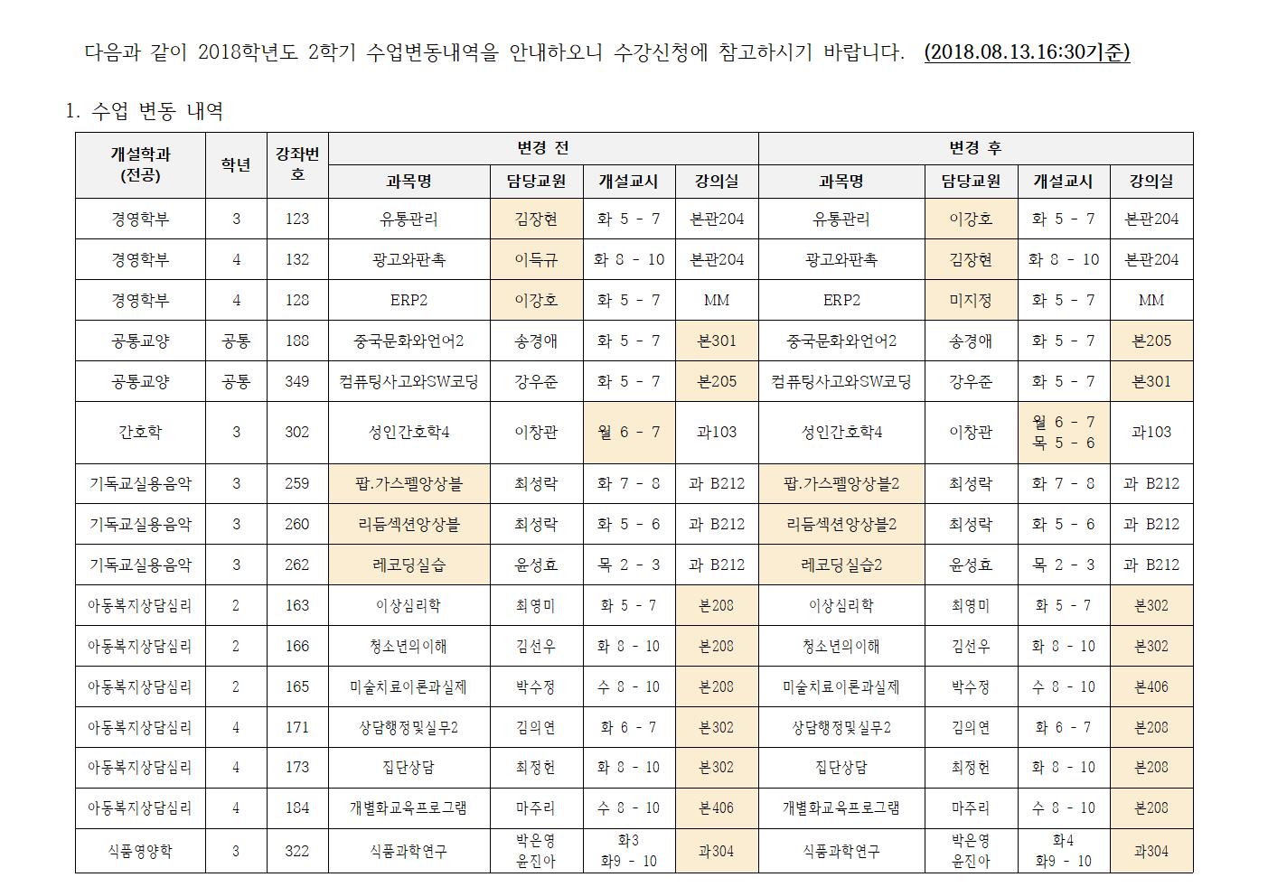 | 제목 | [교무처] 2018학년도 2학기 수업변동내역 안내 (1차 폐강 및 분반) | ||