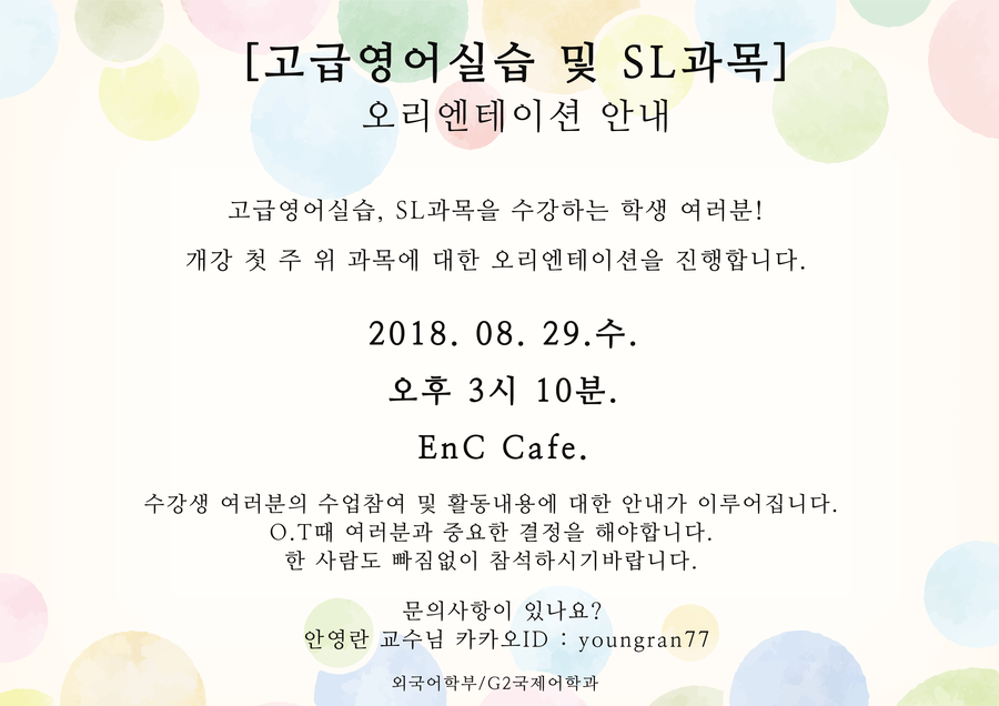 [고급영어실습 및 SL과목]오리엔테이션 안내 고급영어실습, SL과목을 수강하는 학생 여러분! 개강 첫 주 위 과목에 대한 오리엔테이션을 진행합니다. 2018.08.29.(수) 오후3시10분 EnC Cafe 수강생 여러분의 수업참여 및 활동내용에 대한 안내가 이루어집니다. O.T때 여러분과 중요한 결정을 해야합니다. 한사람도 빠짐없이 참석하시기바랍니다. 문의사항 안영란 교수님 카카오ID : youngran77 G2국제어학과 - 02-2600-2523