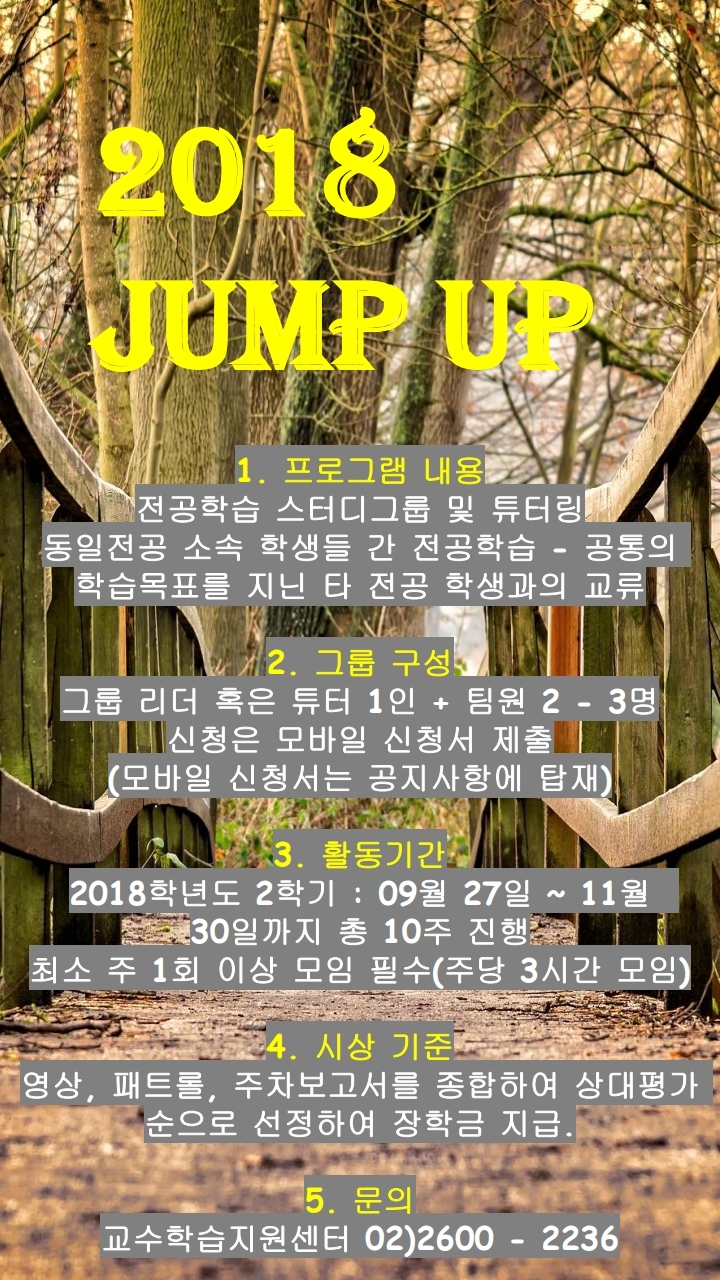 | 제목 | ♥[교수학습지원센터]♥ 2018학년도 Jump Up 프로그램 신청 안내 | ||