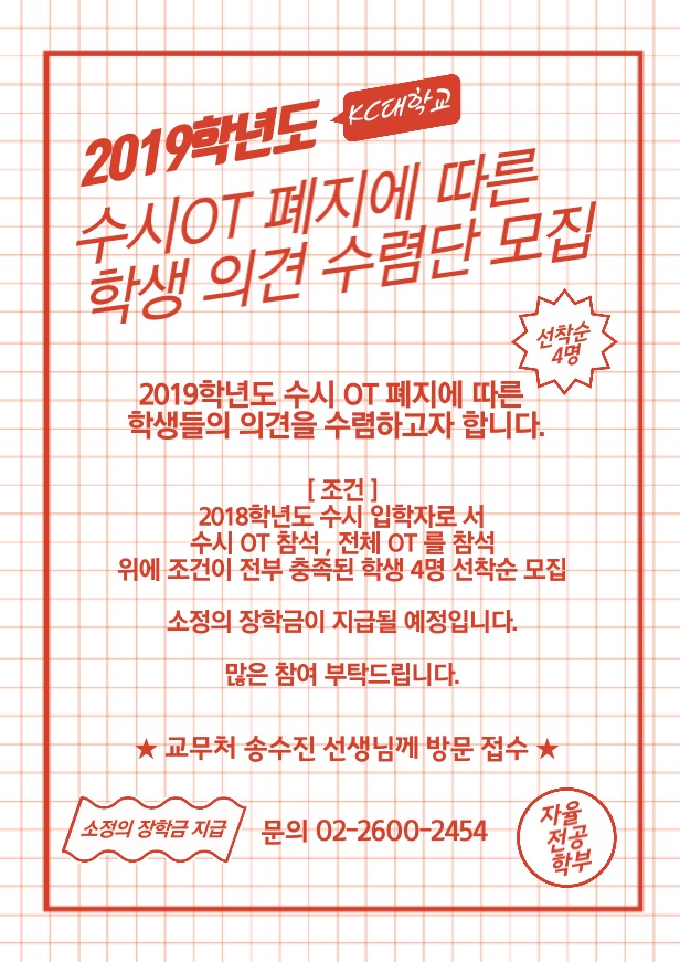 | 제목 | [자율전공학부] 2019학년도 수시OT폐지에 따른 학생 의견 수렴단 모집(소정의장학금지급) | ||