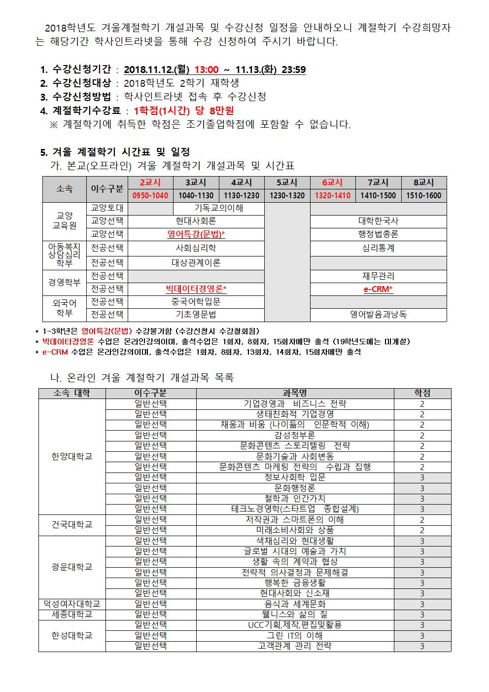 | 제목 | [교무처] 2018학년도 겨울계절학기 개설과목 및 수강신청 일정 안내 | ||