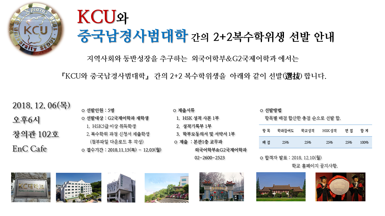| 제목 | [외국어학부&G2국제어학과]KCU와 남경사범대학간의 2+2복수학위생 선발안내 | ||
