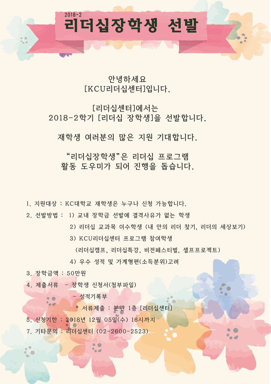 | 제목 | [리더십센터]2018-2학기 리더십장학생 선발 안내. | ||