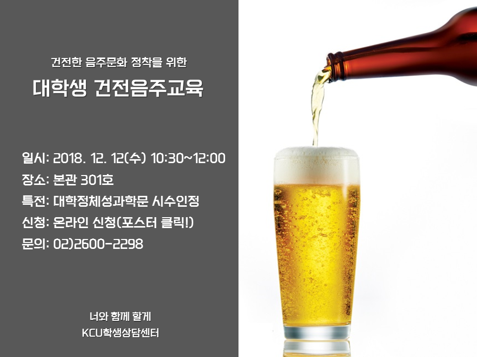 | 제목 | [학생상담센터] 건전음주교육 특강 안내(대학정체성과학문 시수인정) | ||